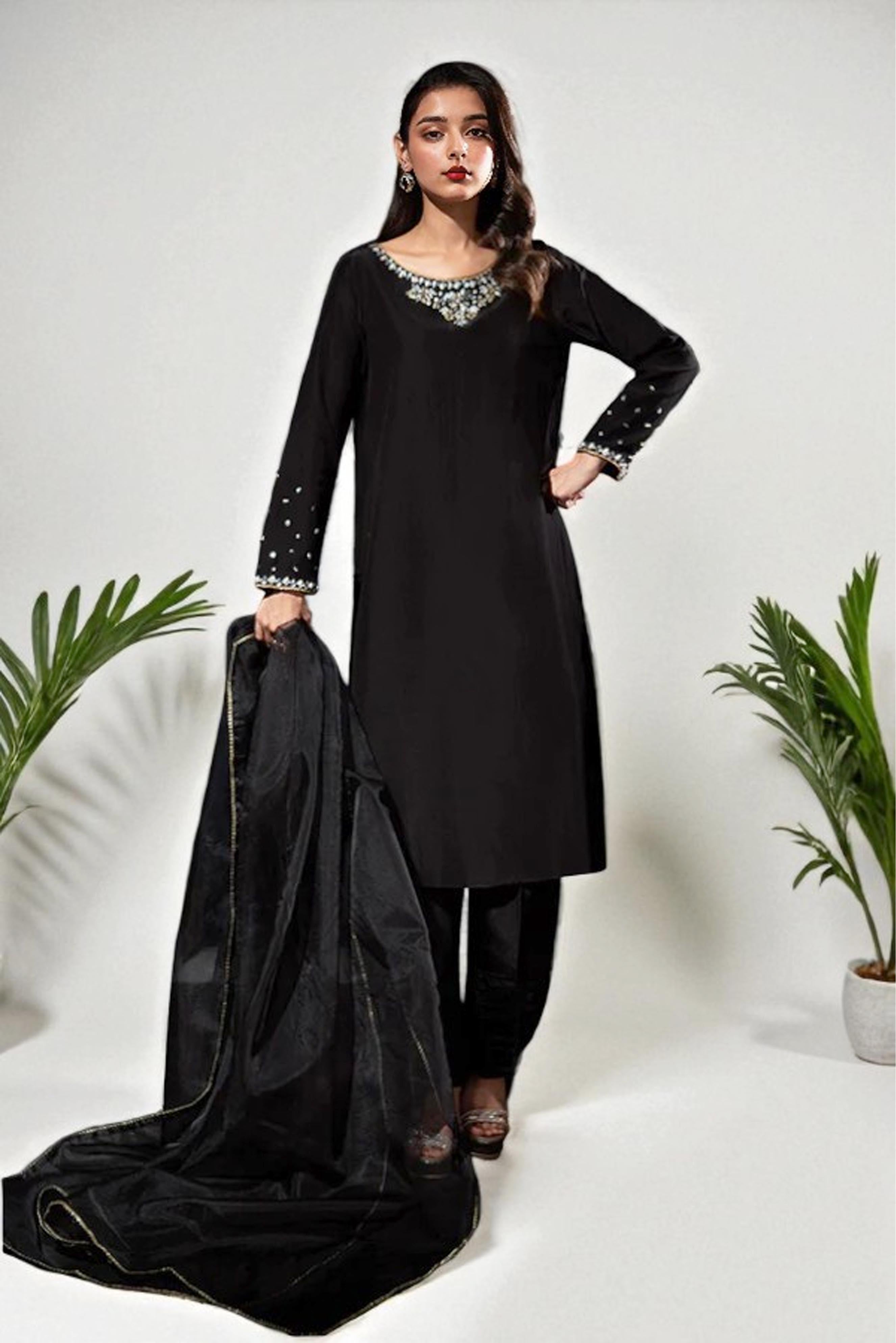 Experience timeless sophistication with our black silk dress, crafted from premium silk for a smooth, graceful drape. This elegant piece features exquisite hand work detailing that adds a touch of artistry and refinement. Designed for modern women who value style and comfort, it’s perfect for formal events or festive evenings. Among our collection of black dresses, this silk dress stands out for its luxurious feel, tailored fit, and captivating elegance — a wardrobe essential for every occasion.