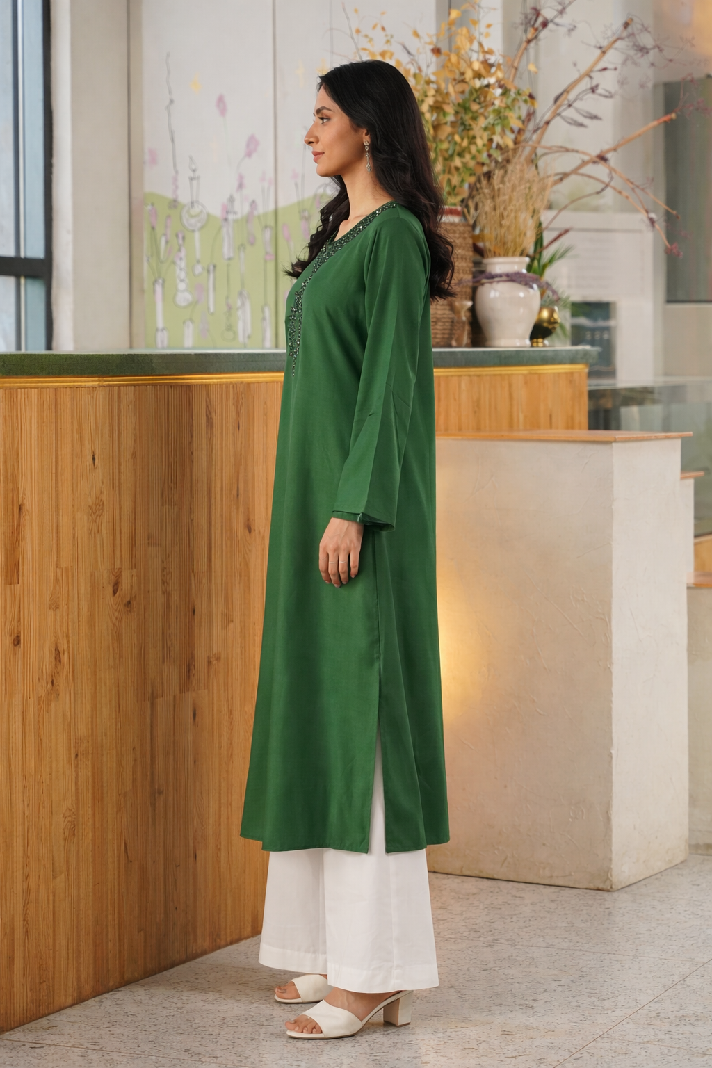 Introducing the Green Embroidered Maxi Dress—a timeless fusion of elegance and festivity. Crafted in a rich bottle green color, this flowy frock suit is a standout piece from our curated girls party dresses collection.